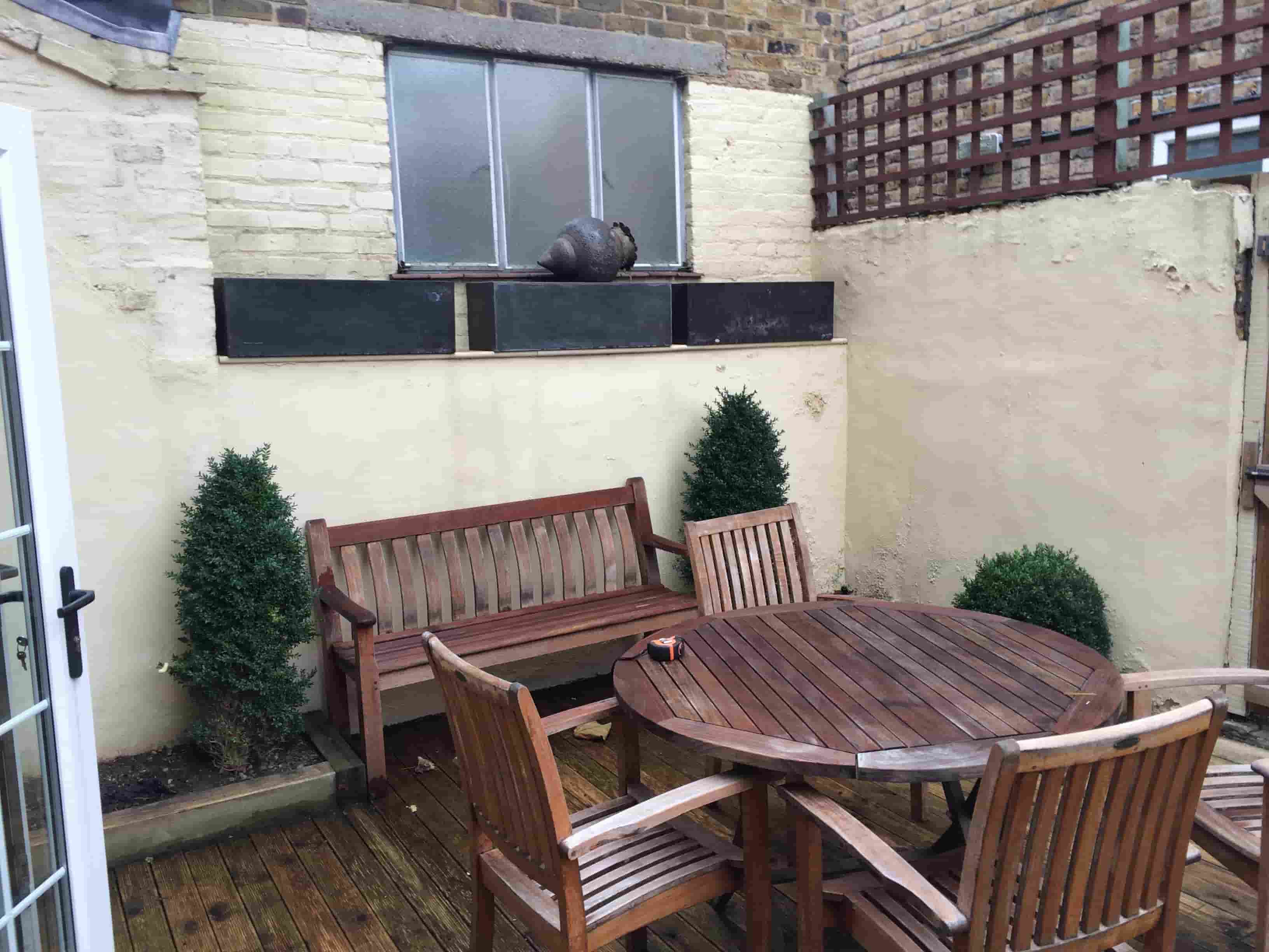 Small outdoor patio with wooden table, four chairs, and a bench; three potted bushes and a watering can on a windowsill against a cream wall in this new rendering.