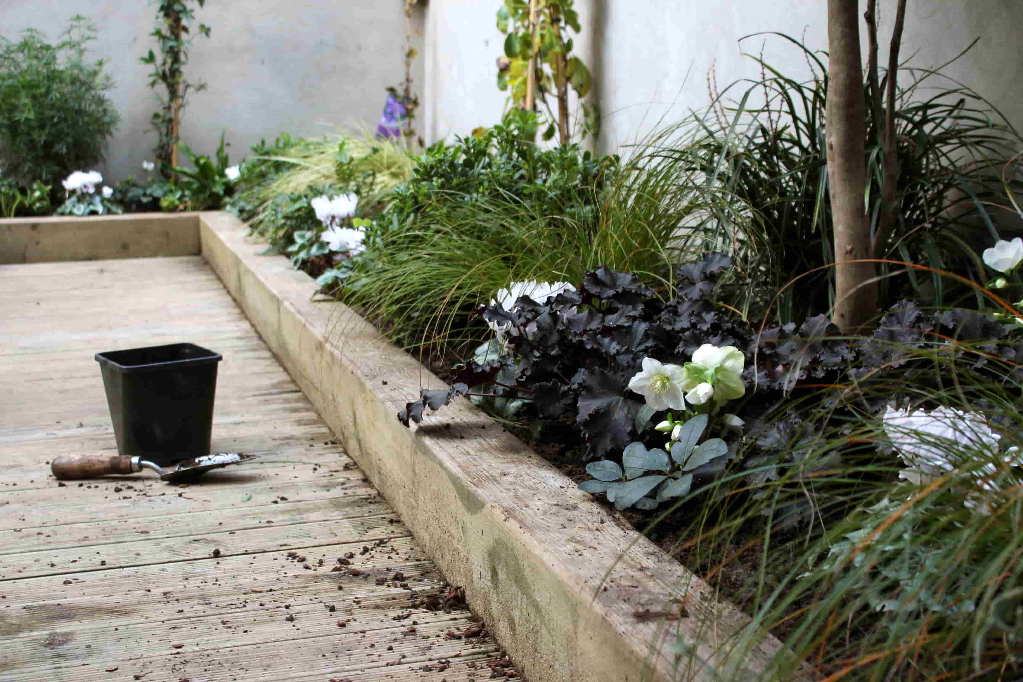A trowel and empty black pot sit on a wooden deck beside a raised garden bed with various green plants and white flowers, featured in this new rendering.