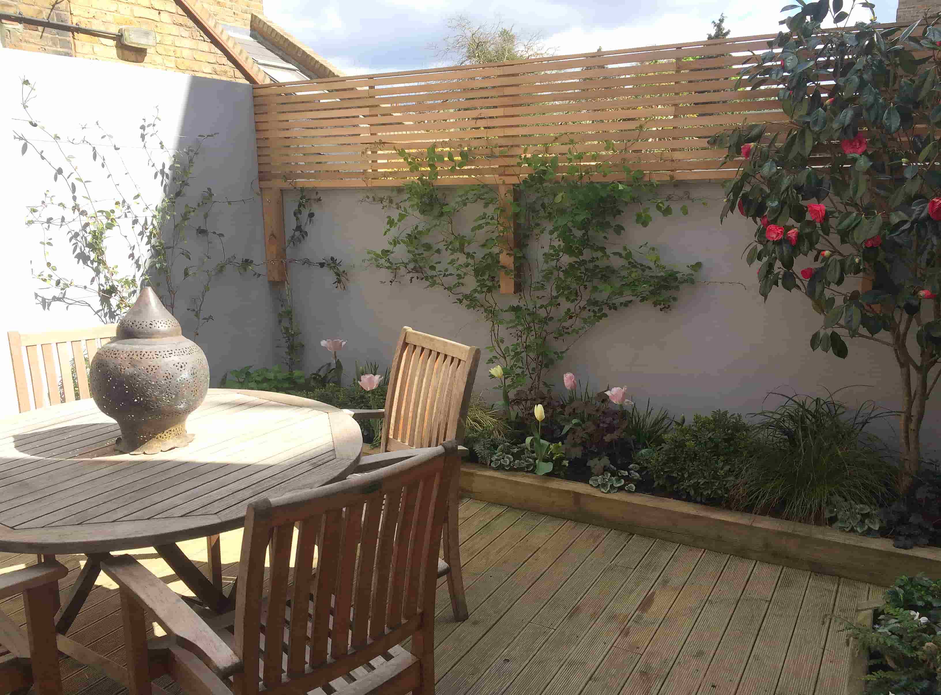 A small garden patio with new rendering on a white wall, wooden decking, a round table and chairs, a decorative lantern, raised flower beds, and climbing plants supported by a wooden trellis.