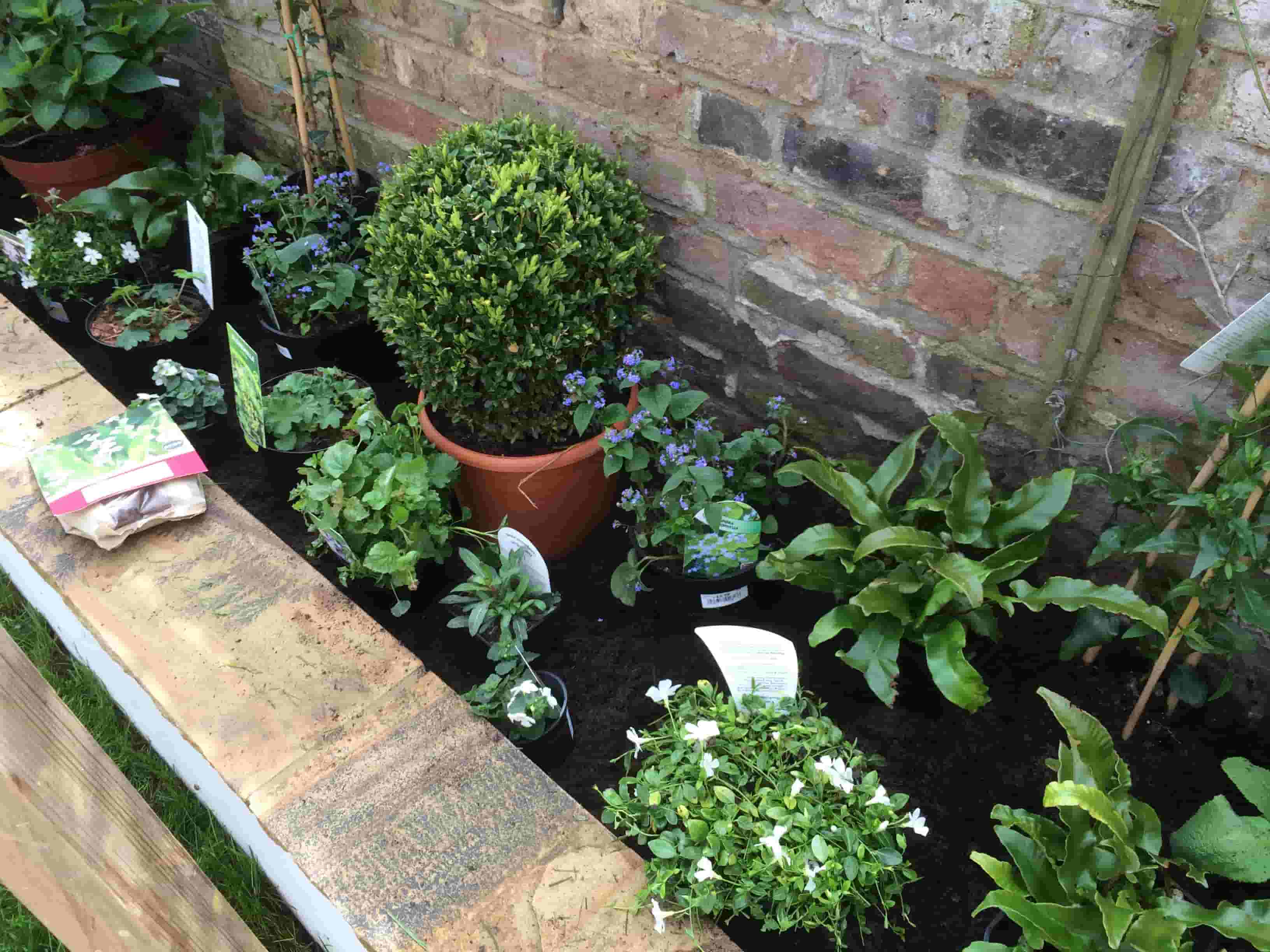 A small garden bed with various potted and planted green plants and flowers sits next to a brick wall, featuring raised beds and visible plant tags in the soil.