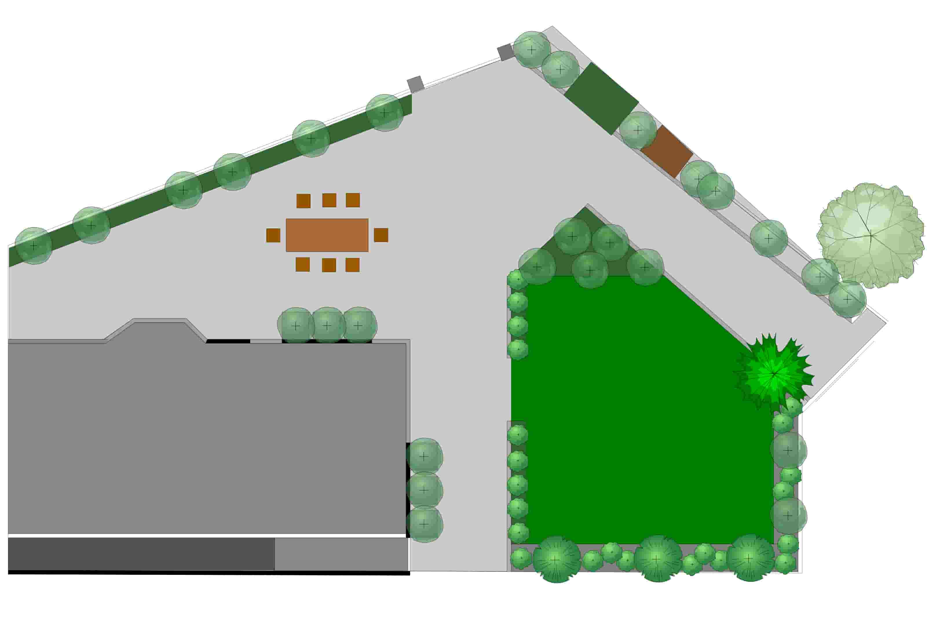 Aerial view of a landscaped yard with a patio dining area, lush shrubs and trees, and a large green lawn area to the right.