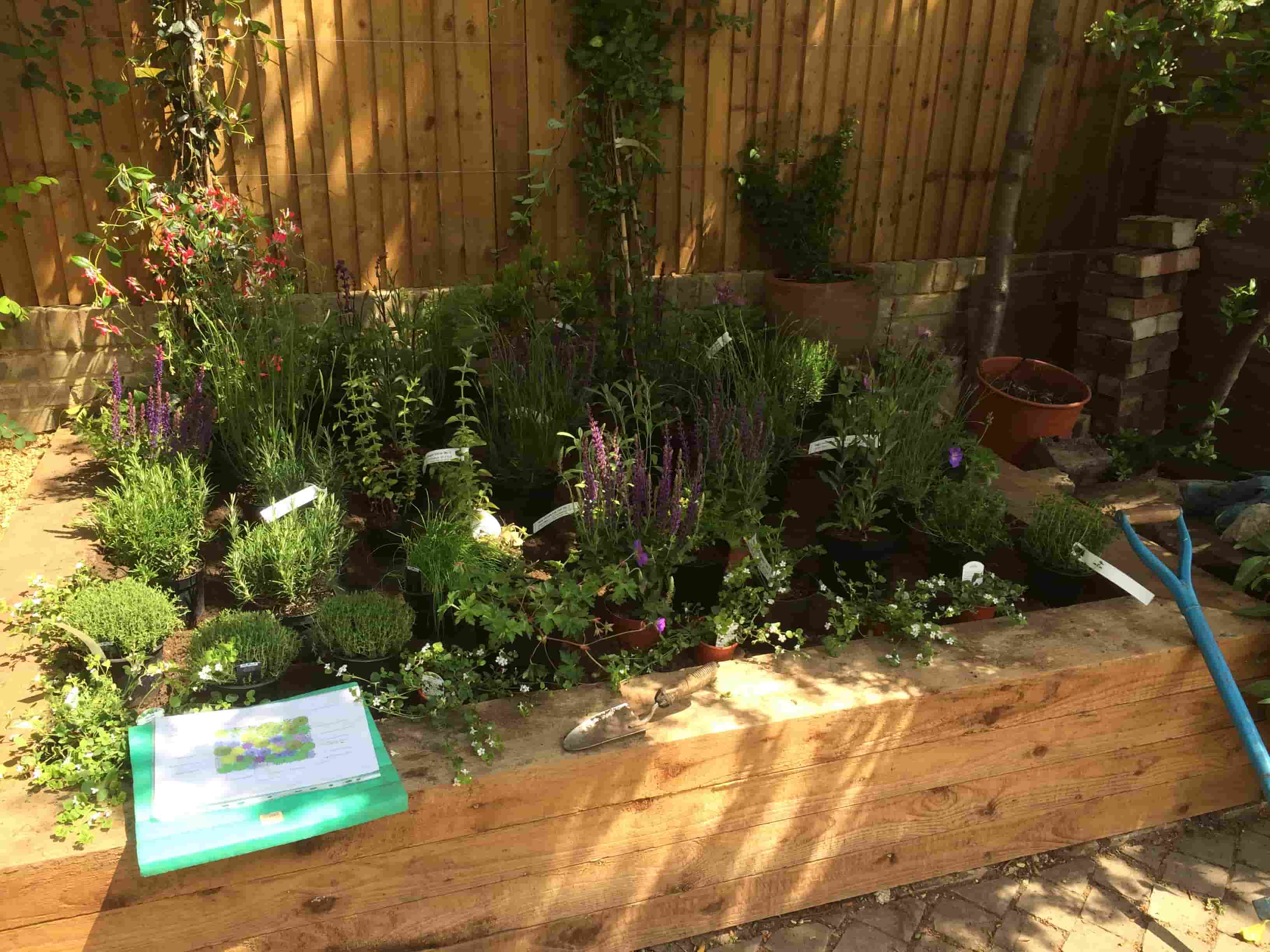 A raised wooden garden bed with various potted plants, shrubs, garden tools, and a folder with a planting plan on a sunny day.