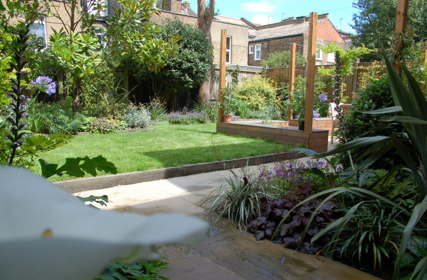 A landscaped Acton backyard garden with a lush lawn, flower beds, wooden posts, and a raised wooden deck, all surrounded by various plants and shrubs.
