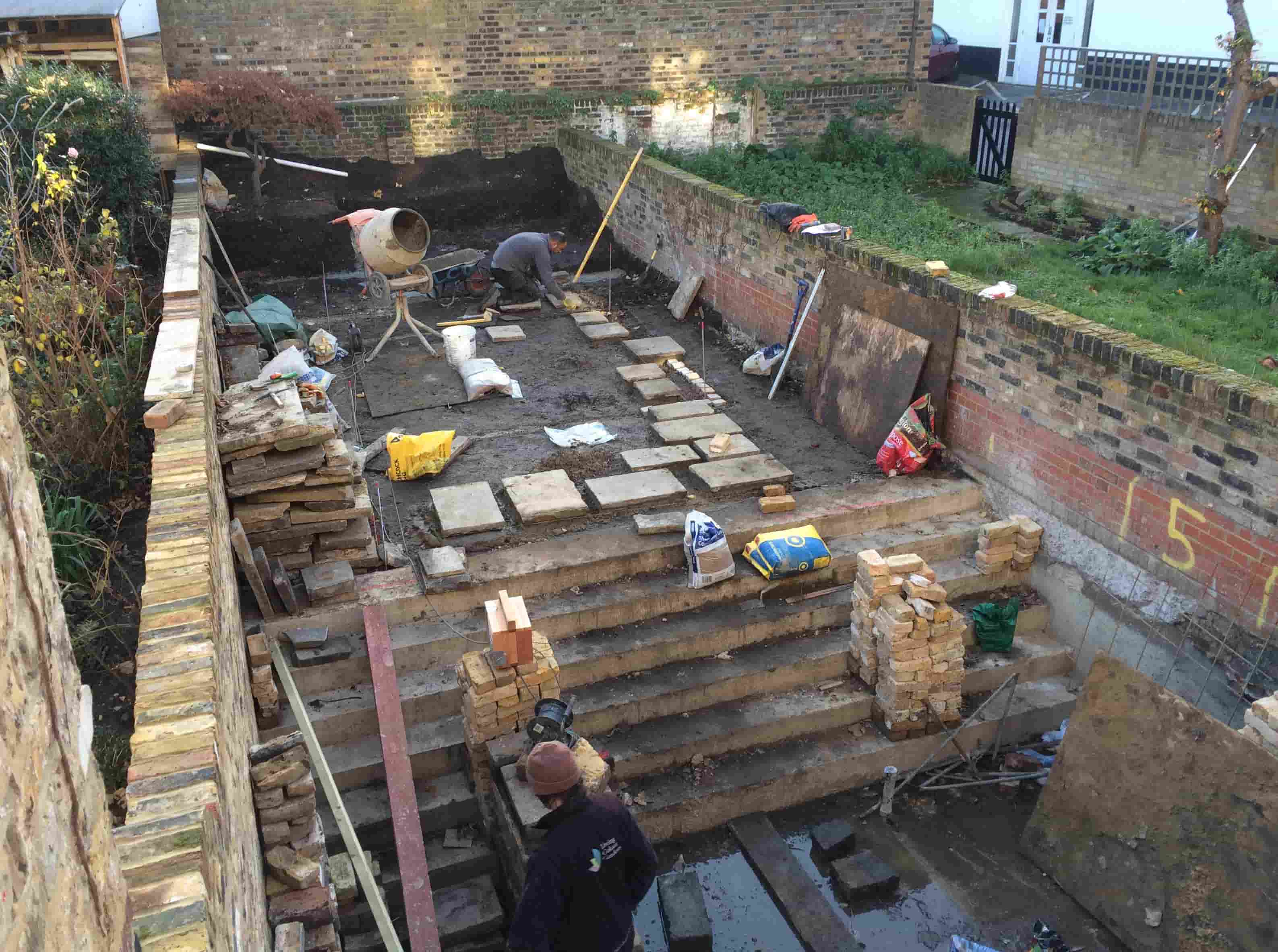 Two workers are carrying out renovations, constructing a garden patio with stone slabs and bricks on a stepped area surrounded by brick walls. Construction materials and tools are scattered around the site.