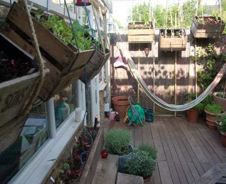 A wooden patio with potted edible plants, hanging planters, a hose, garden tools, and a striped hammock soaking in the sunlight.