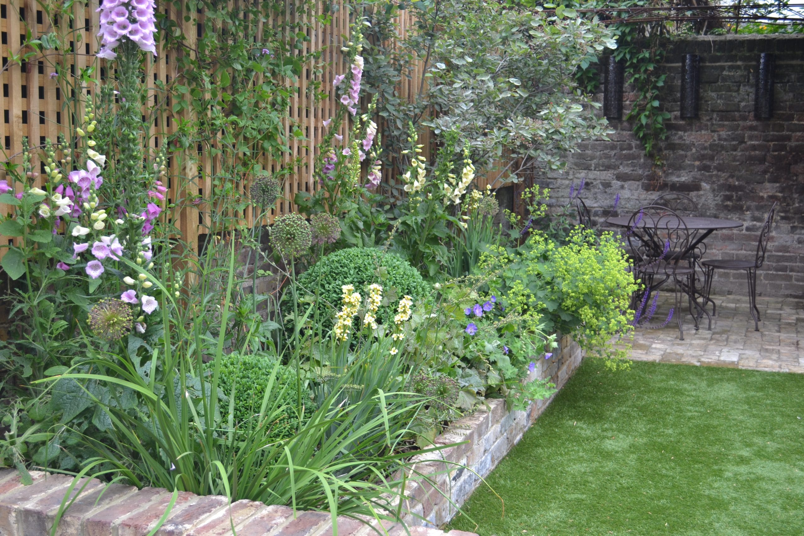 A garden featuring a brick-edged flower bed, lush green plants, purple flowers, a grassy lawn, and a modern floating bench alongside a metal table with chairs beside the brick wall.