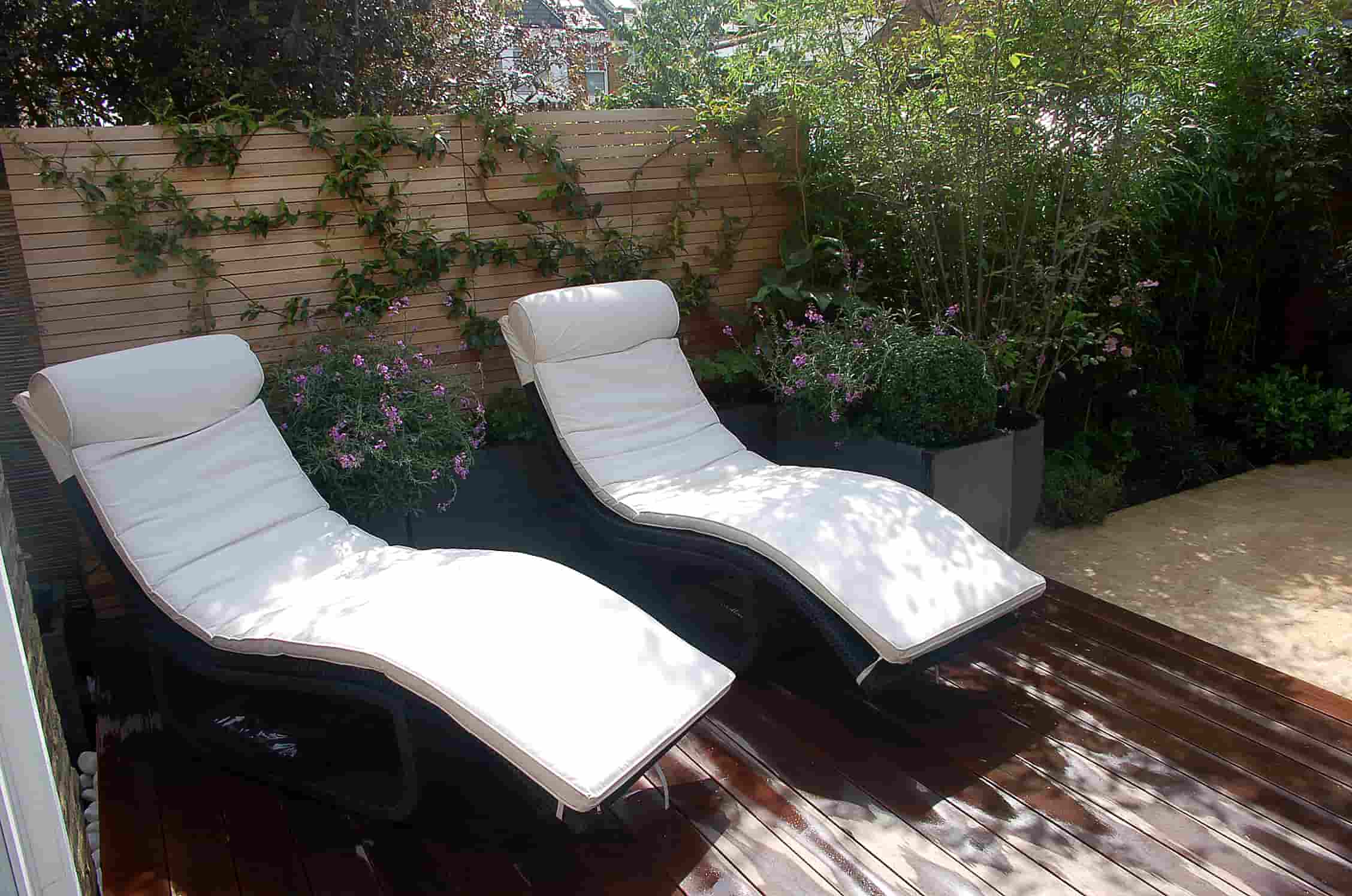 Two white cushioned lounge chairs sit on a wooden deck in a small garden, creating an inviting outdoor room with potted plants and a wooden fence covered in climbing greenery.