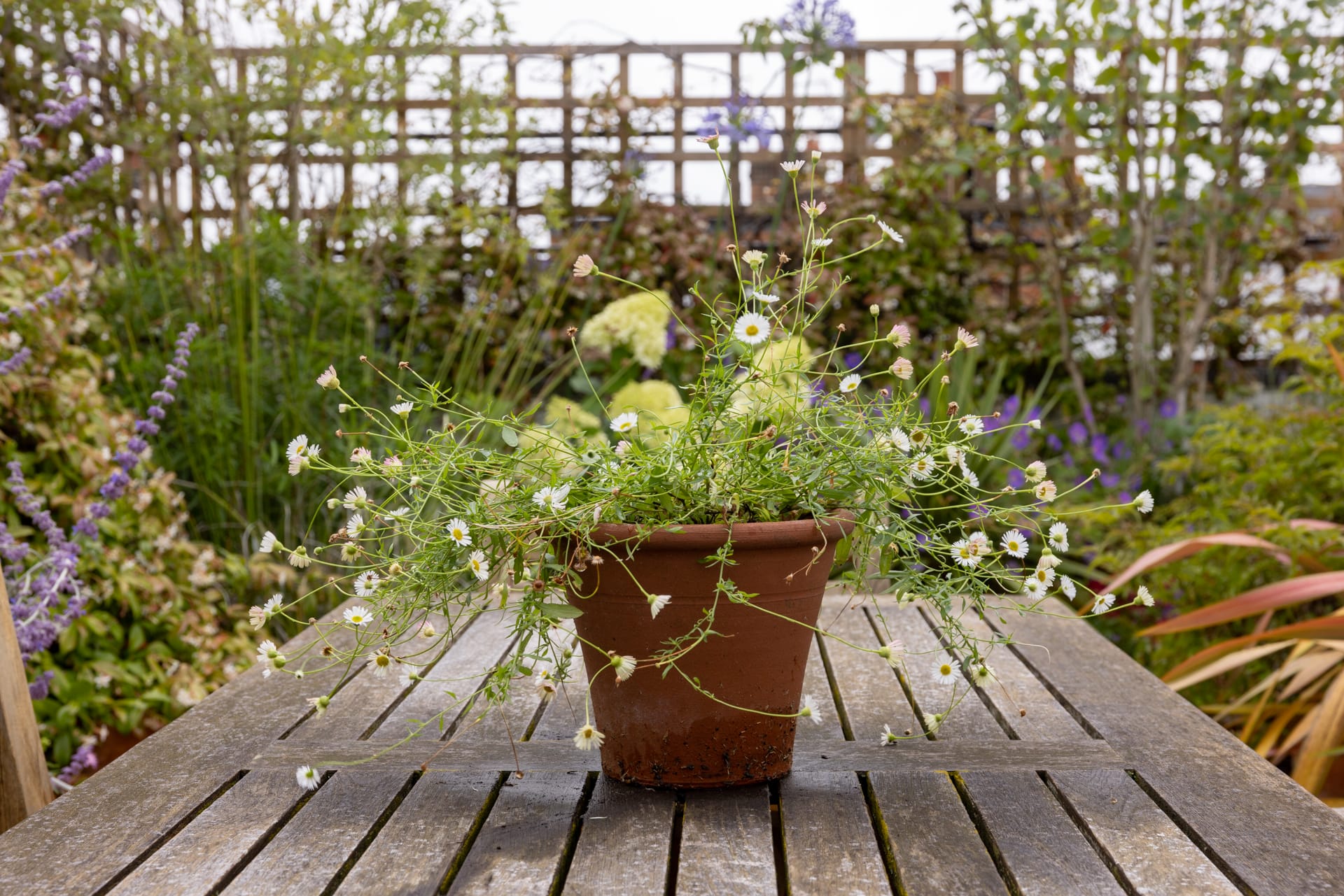 A potted plant with small white flowers sits on a wooden outdoor table in the Portobello Sky Garden, surrounded by lush greenery and a lattice fence in the background.