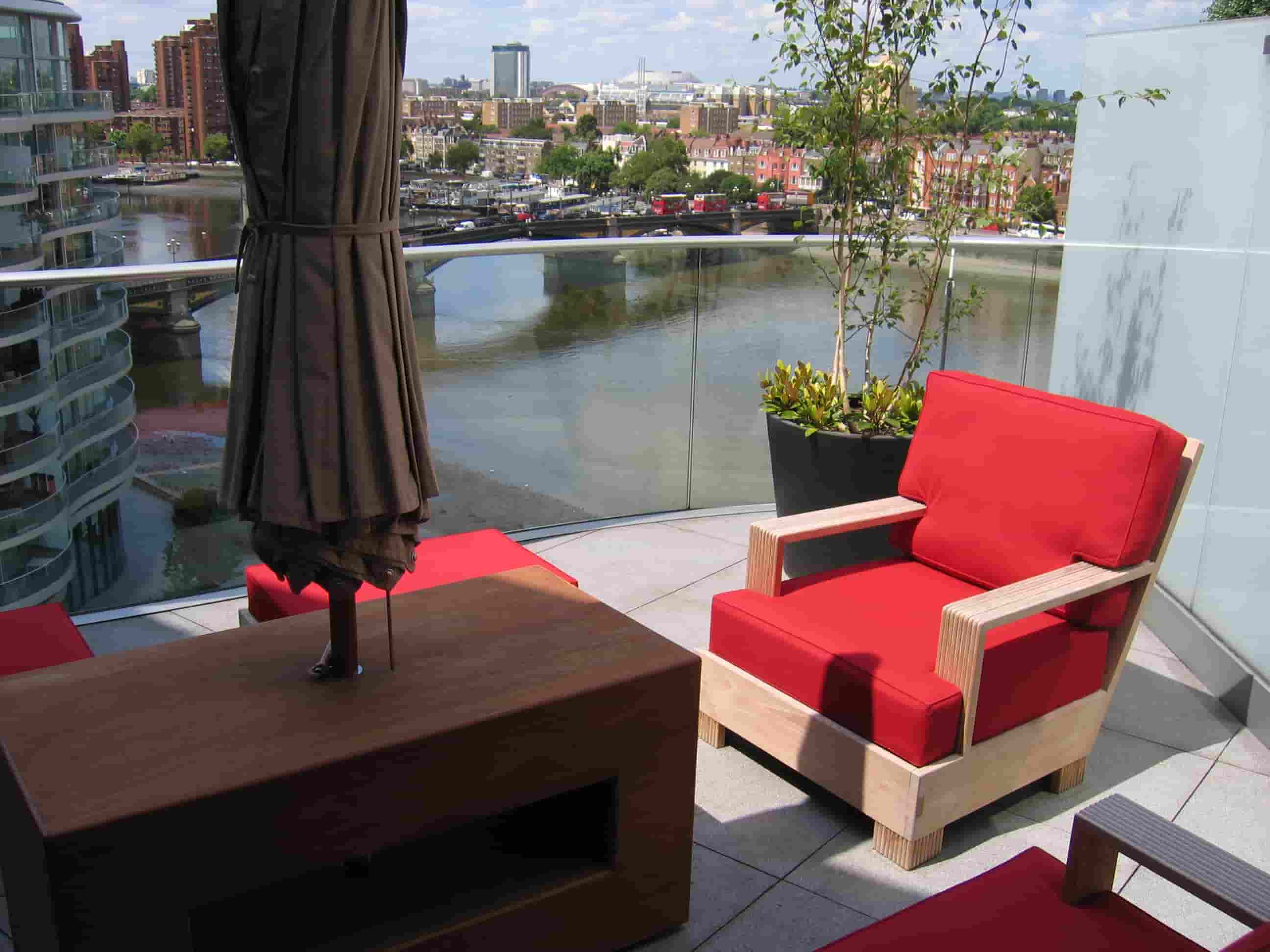 A balcony designed like a cozy roof garden, featuring red cushioned chairs, a table, a closed umbrella, potted plants, and views of the river and city buildings in the background.