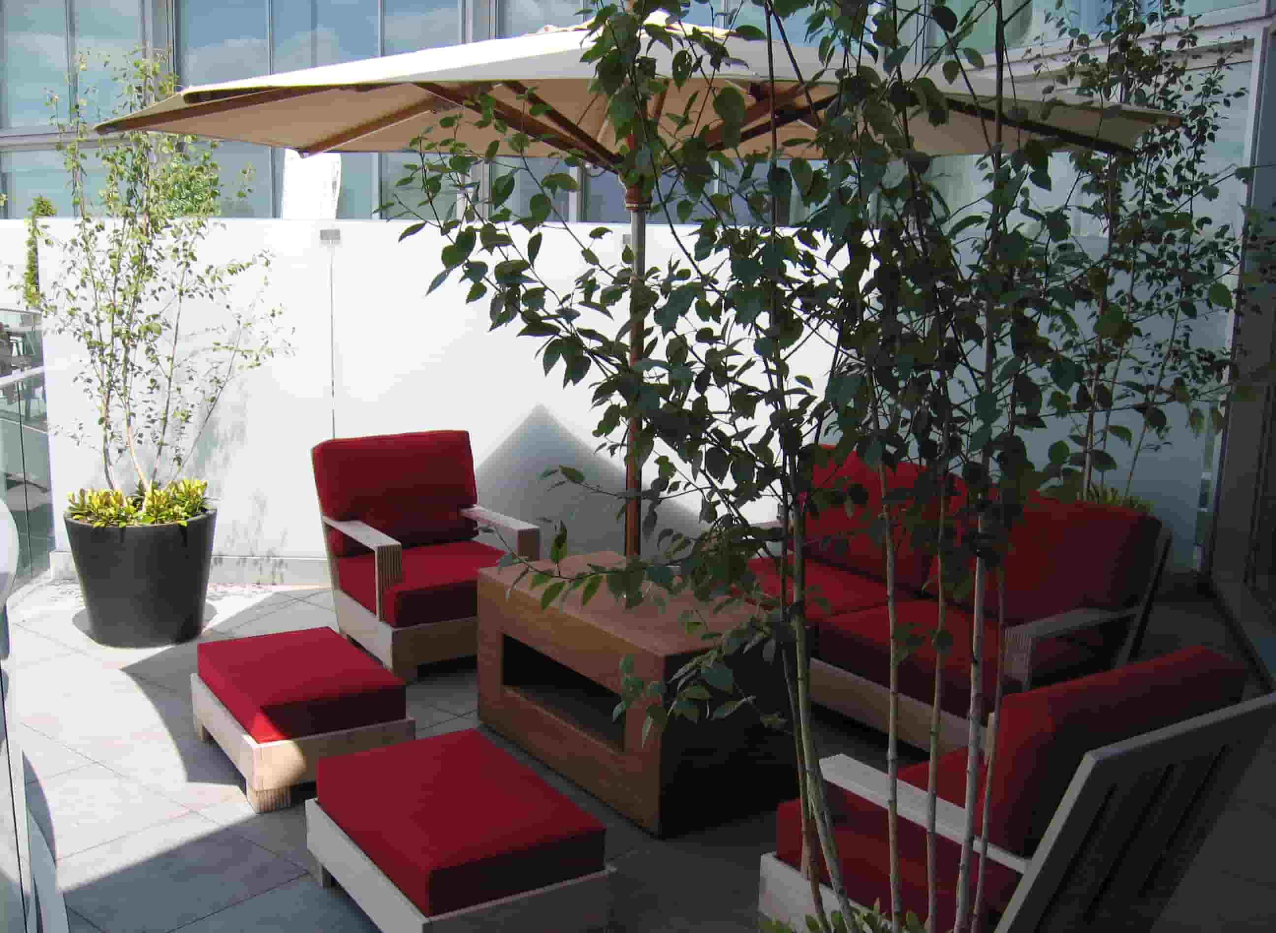 Outdoor patio seating area with red-cushioned chairs and ottomans, a wooden table, large potted plants, and a large umbrella for shade—perfect for relaxing in your own roof garden retreat.