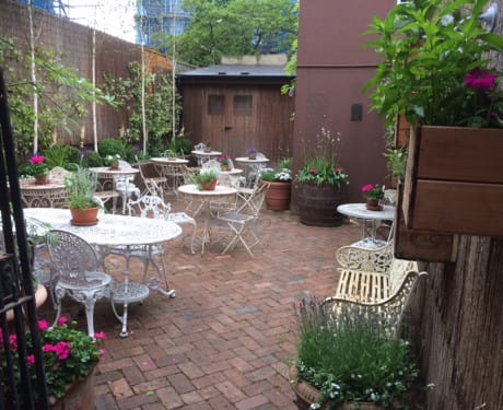 Charming outdoor patio in Shepherd’s Bush with white metal tables and chairs on a brick floor, surrounded by potted plants and flowers, nestled beside a wooden shed and rustic wooden walls.