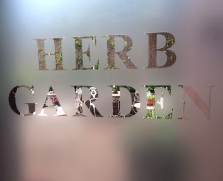 Frosted glass panel with "HERB GARDEN" cut out, revealing lush Shepherd’s Bush greenery and vibrant plants through the letters.