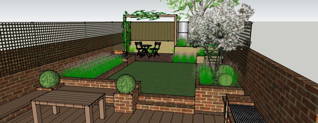 3D rendering of a small Brook Green backyard garden with brick raised beds, a lawn area, seating, fire pit, trees, and wooden fencing.