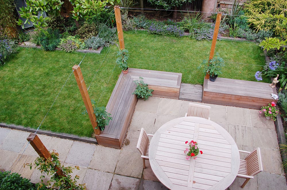 Aerial view of a backyard with garden furniture including a circular wooden table and chairs on the patio, top 10 benches, small plants, and a grassy lawn bordered by flower beds.