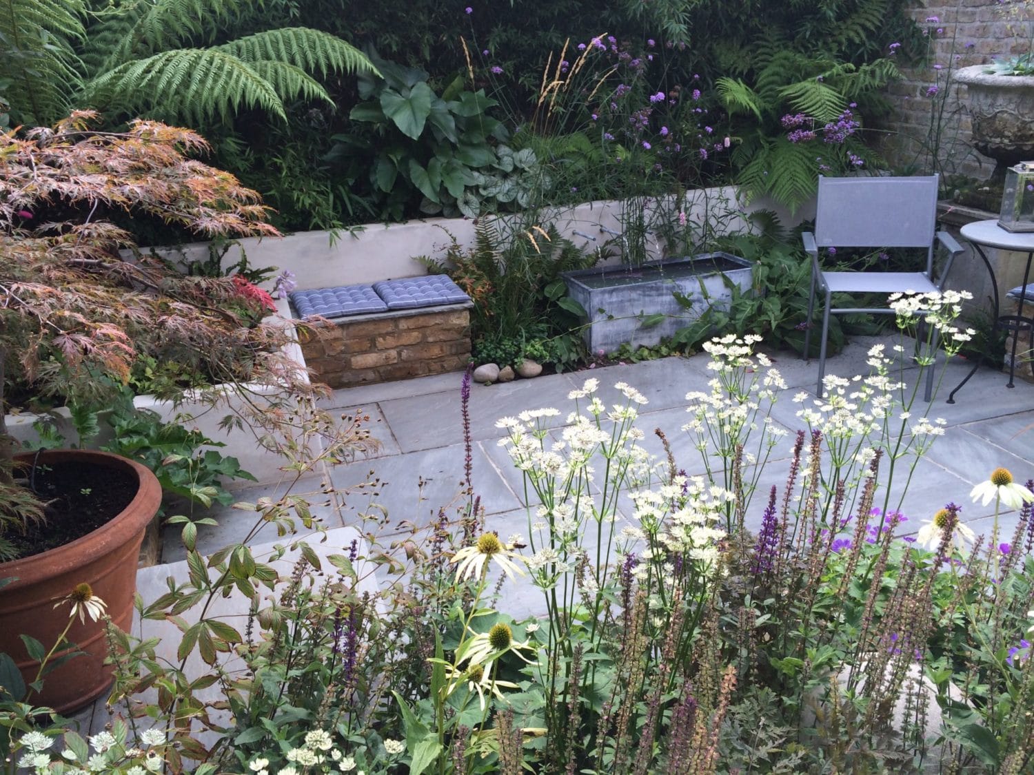 Small patio garden with flowering plants, a potted tree, and one of the best garden benches paired with a chair and table set against a brick wall, surrounded by dense greenery in the background.
