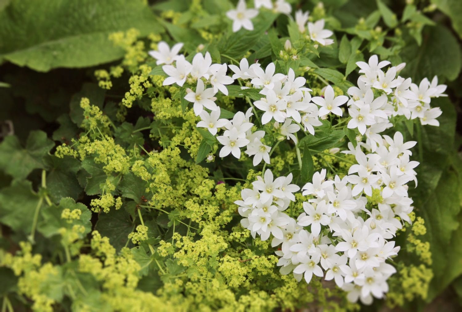 Cluster of small white flowers and delicate yellow-green blooms surrounded by lush green foliage—ideal for companion planting in your garden.