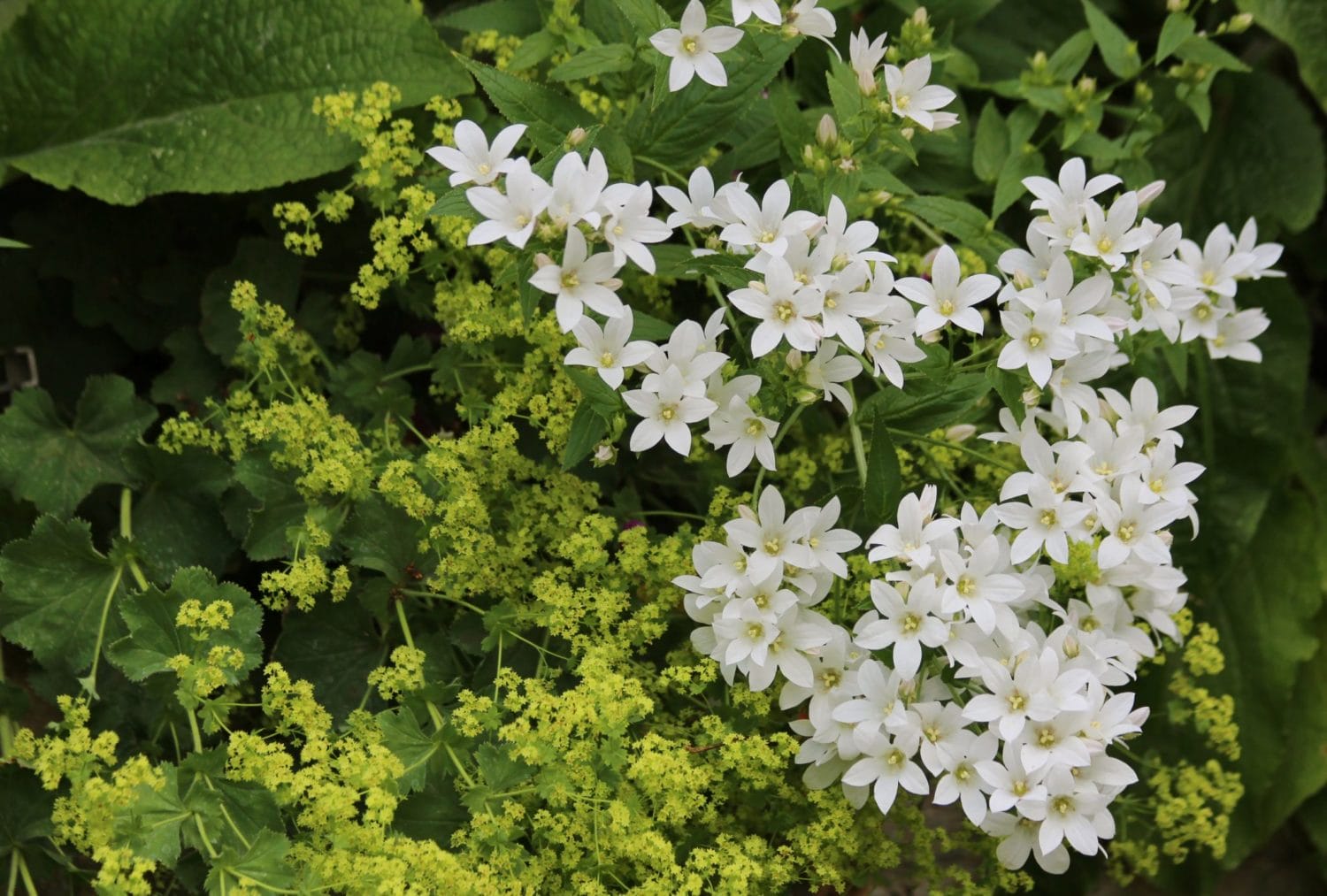 A cluster of white star-shaped flowers grows among green foliage and small yellow-green blooms, making them charming cottage garden plants for cottage style borders.