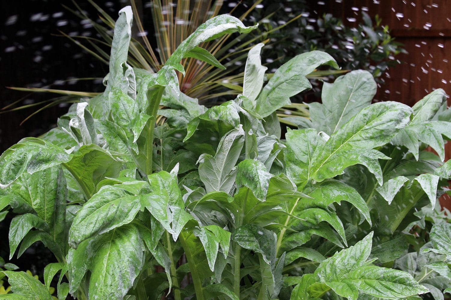 Large green leaves of artichoke, a classic cottage garden plant, display visible white powdery mildew; the background features additional foliage and a wooden fence, evoking traditional cottage style borders.