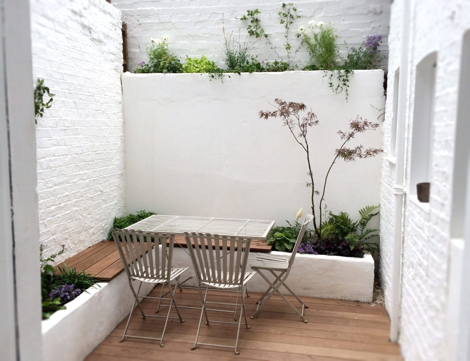 A small outdoor patio with a metal table and three chairs, surrounded by white brick walls and raised planters with various green plants—one of the top 10 smart designs for small spaces.