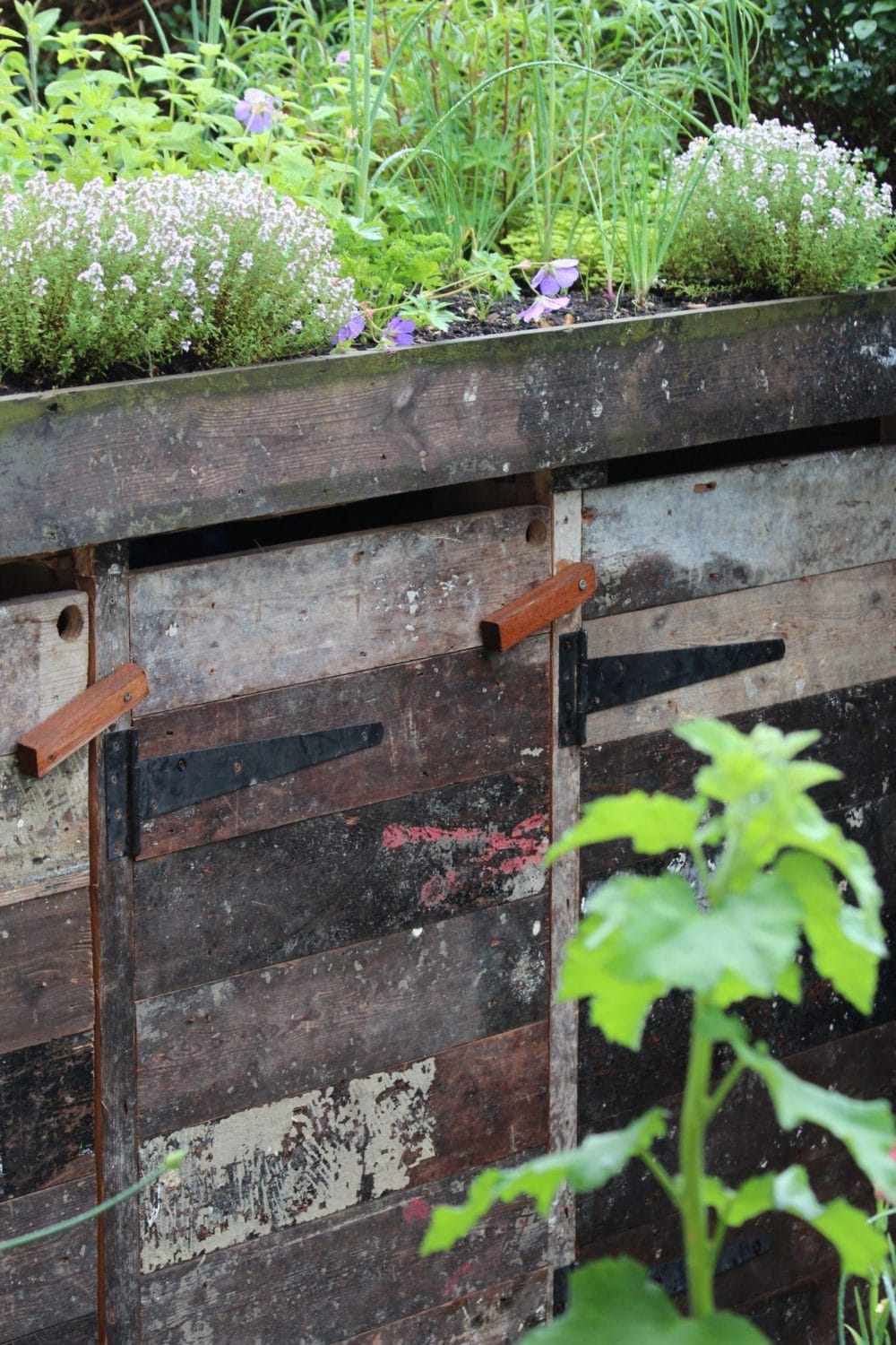 A close-up of a weathered wooden compost bin with metal hinges in a garden, topped with blooming herbs and flowers—an eco-friendly alternative to traditional bin sheds and storage units.