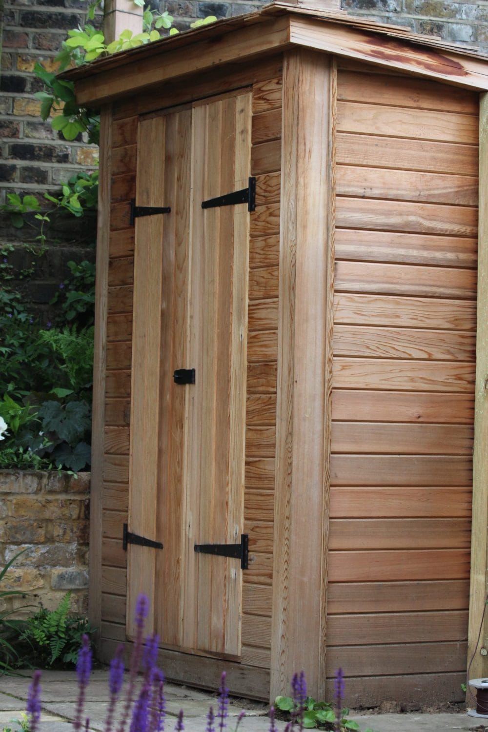A small wooden bin shed with vertical planks, double doors, and black metal hinges stands beside a brick wall and some greenery.