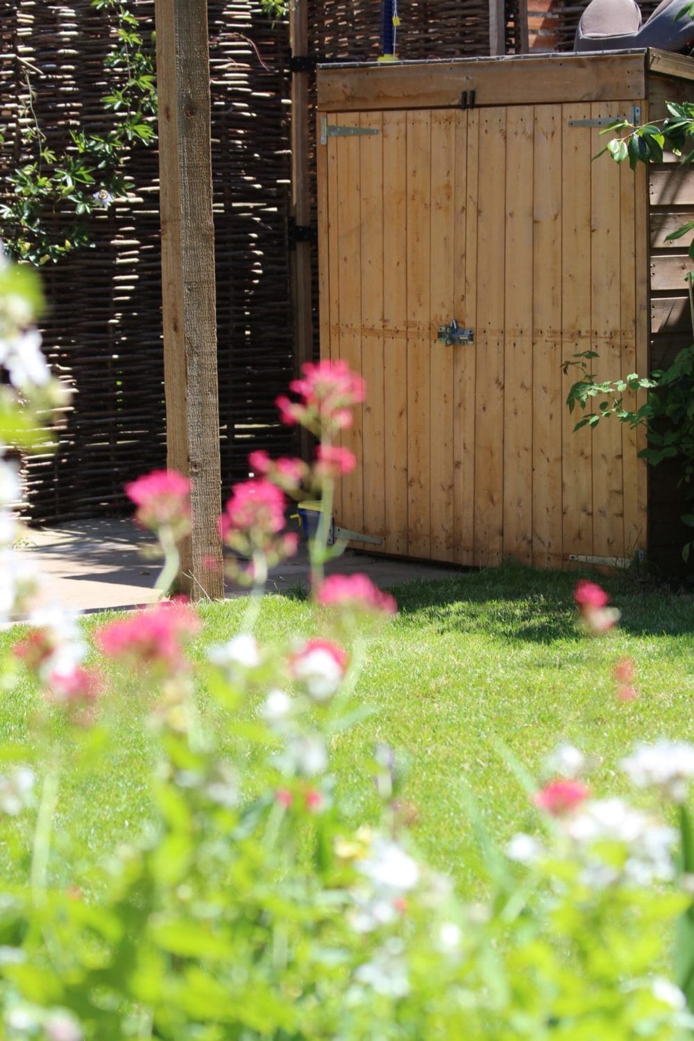 A wooden garden shed, ideal for use as storage units or bin sheds, stands with a closed door behind a green lawn and out-of-focus pink and white flowers in the foreground.