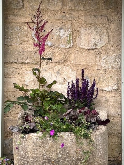 A stone planter against a brick wall contains various flowering plants, including tall pink and purple blooms with green foliage that attract bees.