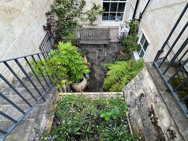 A small stone courtyard with a wooden bench, potted plants, ferns, and greenery attracts bees, all enclosed by stone walls and metal railings.