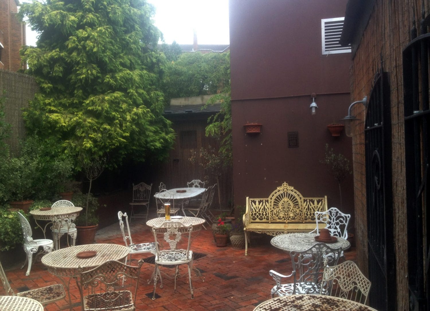 Outdoor patio with white and gold wrought iron tables and chairs on a red brick floor, surrounded by lush plants, herbs, and trees, next to a brown building wall.