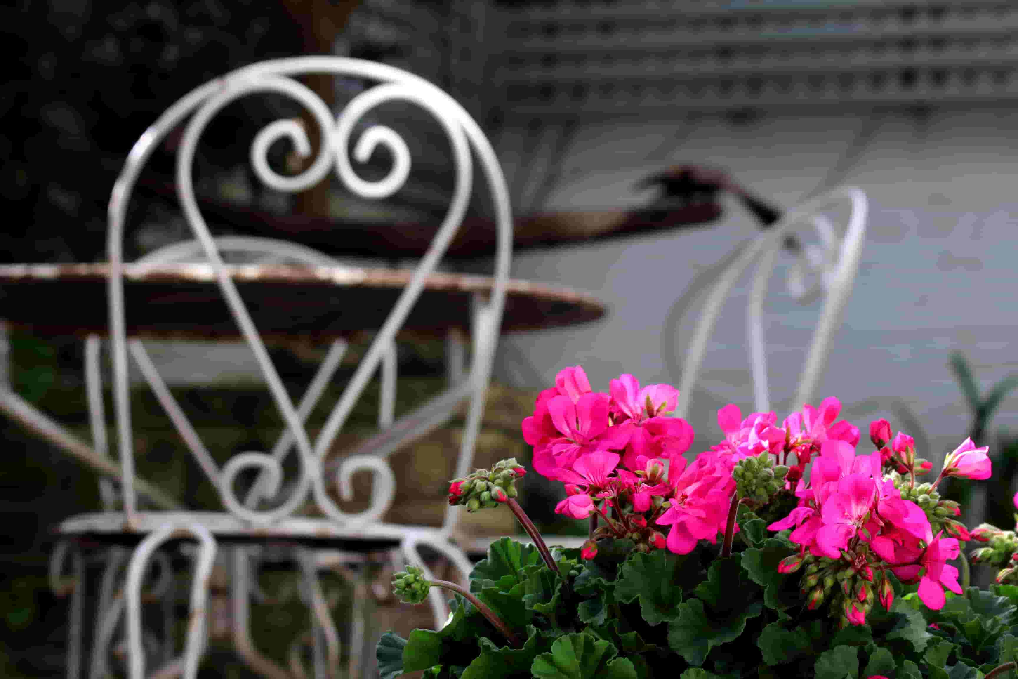 A soft and feminine design with some rustic accessories, a typical Chelsea garden. The main focal point is a bespoke York stone water feature which matches the paving. The grey horizontal battened trellis is covered with climbers including evergreen jasmines, Ceanothus, Wisteria and climbing roses. The reclaimed brick raised beds host seasonal planting which flower throughout the year, and during spring a display of Alliums and Tulipa Angelique planted en masse spice up the garden. The white metal table and chairs match the Mediterranean feel of the olive trees, especially with the rustic terracotta pots planted with geraniums on the steps.