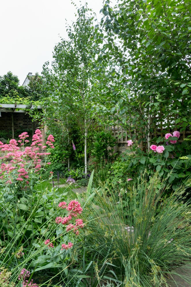 A lush garden with cottage style planting features tall green trees, pink flowering plants, ornamental grasses, and a wooden fence in the background.