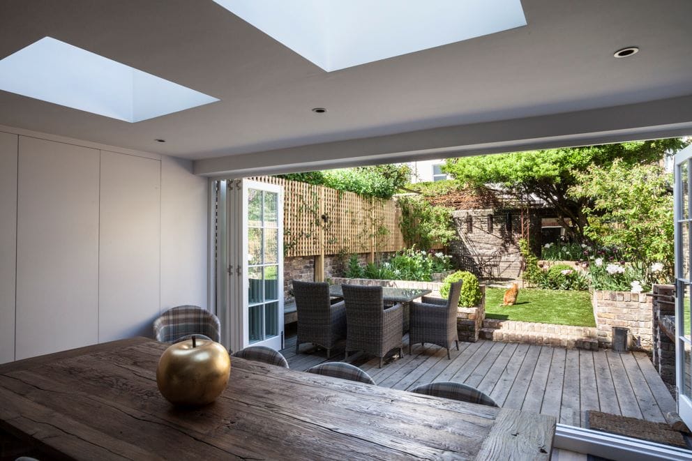 A wooden dining table with a gold apple ornament overlooks a patio with outdoor seating and a landscaped garden through open glass doors.