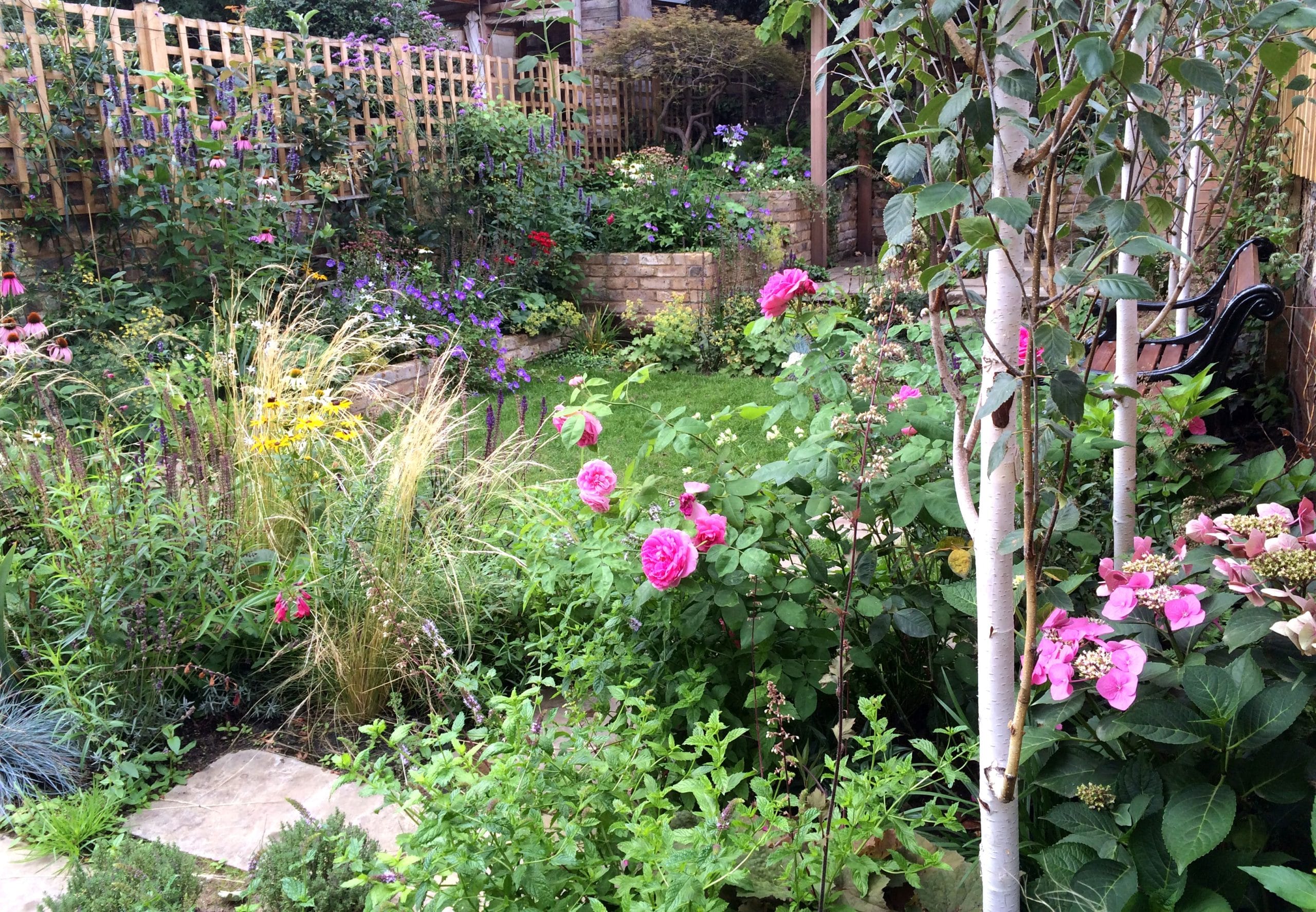 A lush garden with various flowering plants, including pink roses and hydrangeas, green foliage, and a wooden trellis fence in the background.