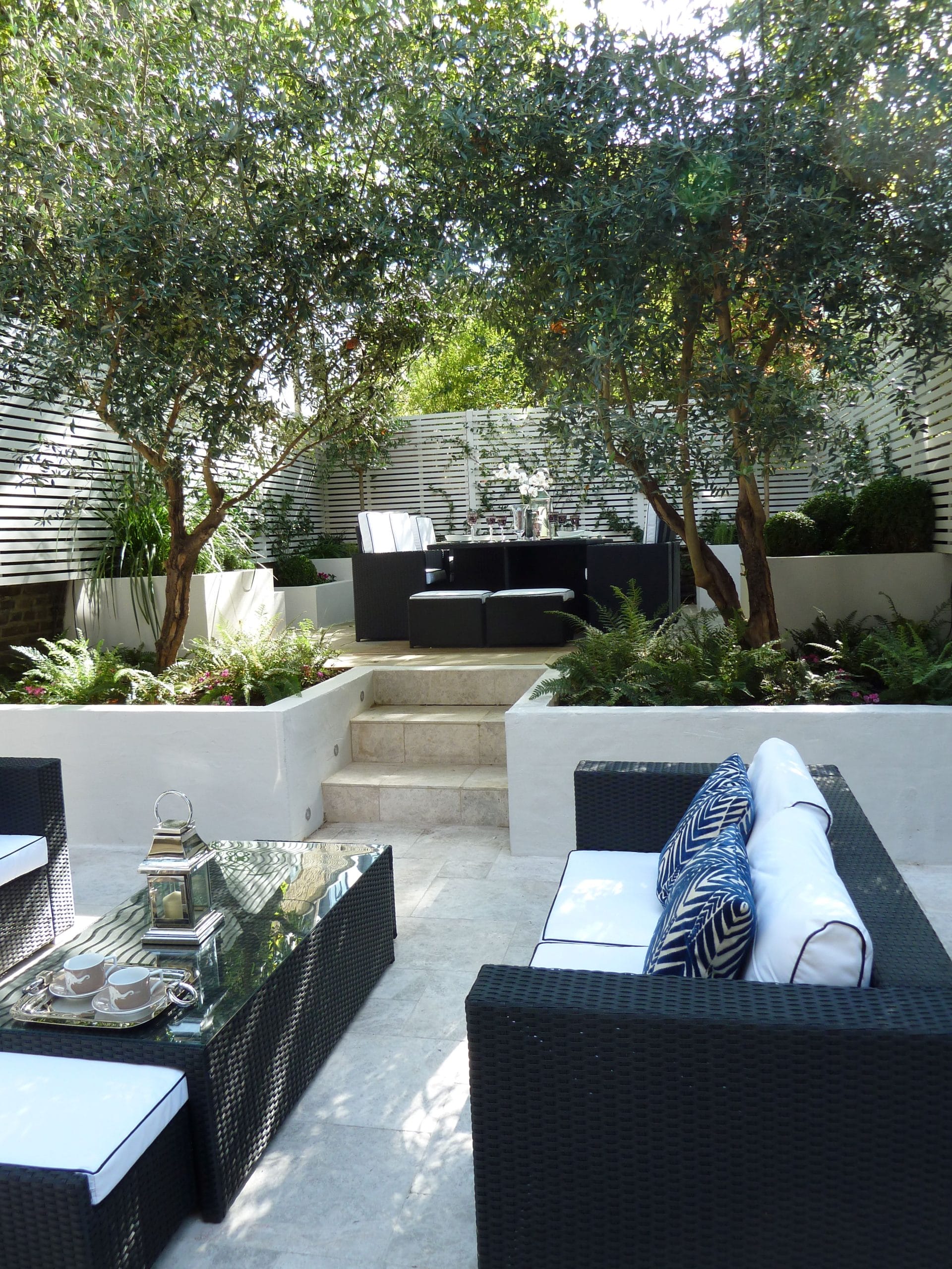 Modern outdoor patio with black wicker furniture, white cushions, blue accent pillows, glass coffee table, greenery, and trees surrounding a raised seating area.