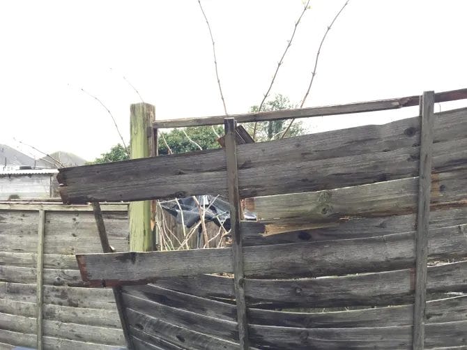 A broken wooden fence with several loose and misaligned planks, with some branches and trees visible in the background.