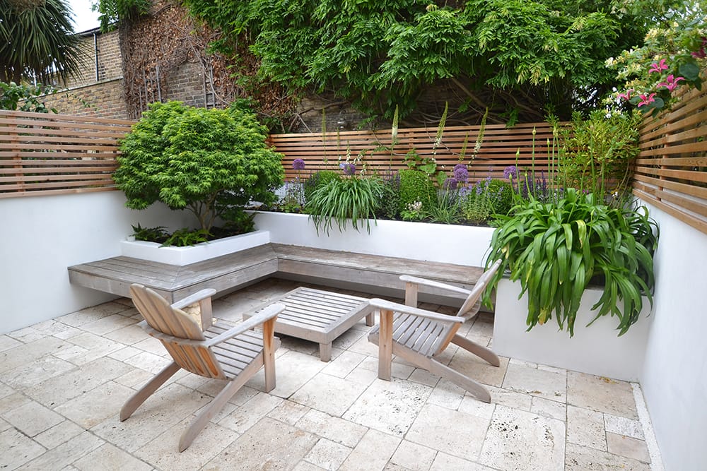A modern patio with two wooden lounge chairs, a matching table, a built-in wooden bench, tiled flooring, and lush green plants along the fence.