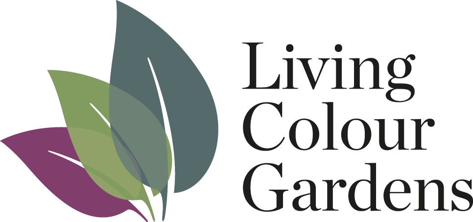 Logo with three overlapping leaves in green, purple, and dark teal beside the text "Living Colour Gardens" in a serif font.