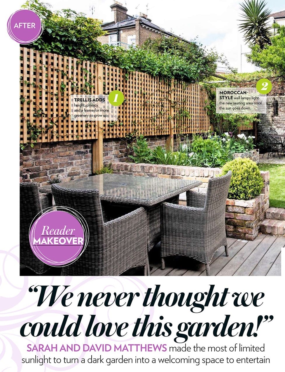 A modern garden patio with a wicker dining set, trellis fence, stone walls, and well-maintained plants in a small urban outdoor space.